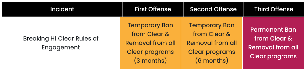 - Repercussions: If HackerOne determines the Finder has violated the Code of Conduct and/or these RoEs, there will be disciplinary actions depending on the severity and HackerOne’s assessment of intent. Repercussions could include, depending on severity, temporary bans and permanent bans from HackerOne Clear, HackerOne Clear programs and/or the platform.