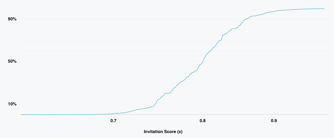 Using this score, we distribute every eligible hacker over a logistic function. Initially, hackers with a higher score will receive the majority of the invites. As the program matures and more hackers are invited, the chances to include hackers with lower scores gradually increases.