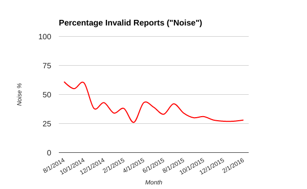 Although we've made improvements, there still remains a noise level of 28% on the platform. In other words, 28% of all reports received by customers are categorized as "not applicable" or "spam." Studying the sources of these remaining invalid reports, we found that 50% of this noise is generated by just 10% of the hackers on the platform. Signal Requirements and our updated Rate Limiter serve to further reduce this remaining noise.