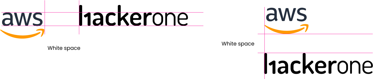 When showing HackerOne with a partner brand, both logos should have equal sizing. Be sure to keep enough white space around each logo to ensure that they read individually. The order of the logos will depend on the partnership and should be determined on a case-by-case basis.