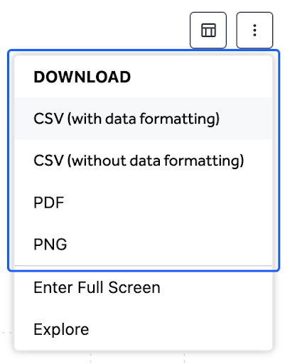 Each chart allows you to download as CSV, PDF, or PNG image files using the kabob menu (three vertical dots).
