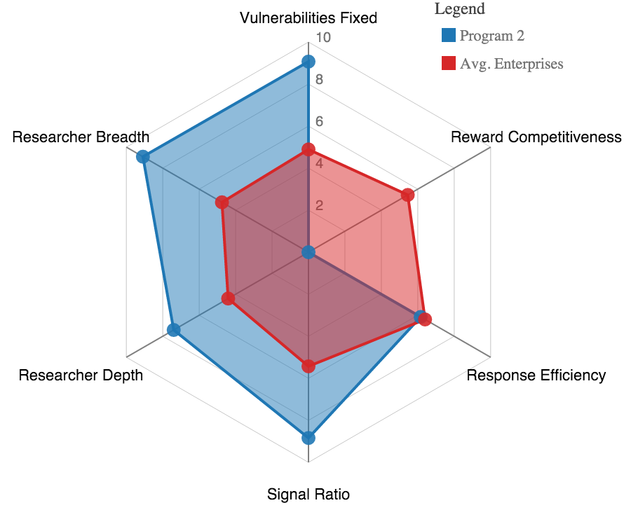 Take, for example, these spider chart visualizations of the HSI for two successful programs, graphically representing two large enterprise programs: one that offers bounties, and one that does not. Program 1, on the left, is one of the most successful programs in our dataset, topping the charts for Vulnerabilities Fixed and Researcher Breadth and Depth--advantages for public programs--and getting high marks in Reward Competitiveness as well. Program 2, on the right, also does very well in most dimensions, despite offering no monetary bounty at all. These examples suggest two things. First, you can clearly have a successful disclosure program without offering bounties, but with a slight cost to Researcher Breadth and Depth. Second, you should ignore dogma and use data to determine which incentives produce the ideal outcome for your organization and its unique circumstances.